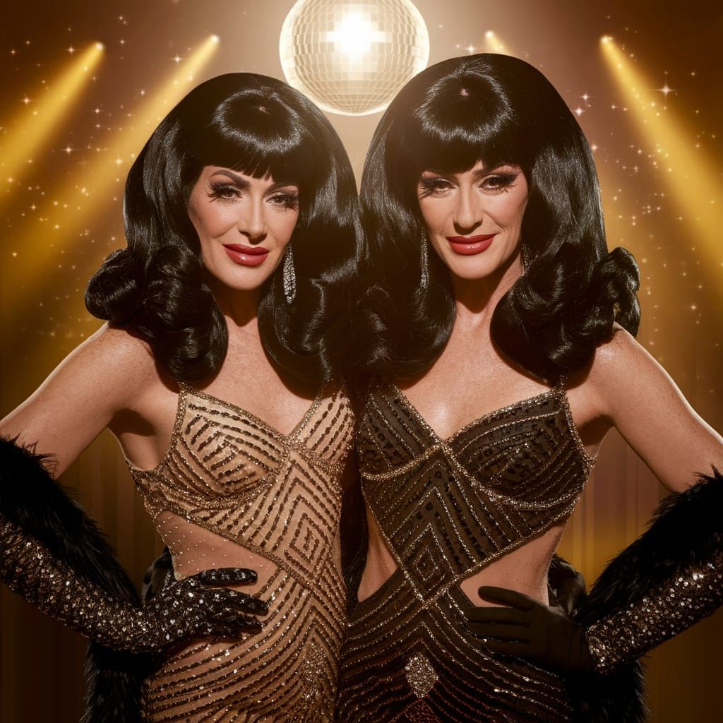 A striking picture of a stylish cross-dressing couple in disco attire. The pair are dressed in the style of 1970s Baccara, complete with glittery accessories and shimmering dresses in a warmly lit scene.