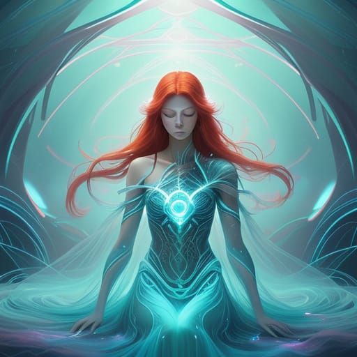 This image shows a woman with red hair resting in an otherworldly healing chamber. Ethereal digital art features glowing energy and soft, cool colors for a serene, fantasy aesthetic.