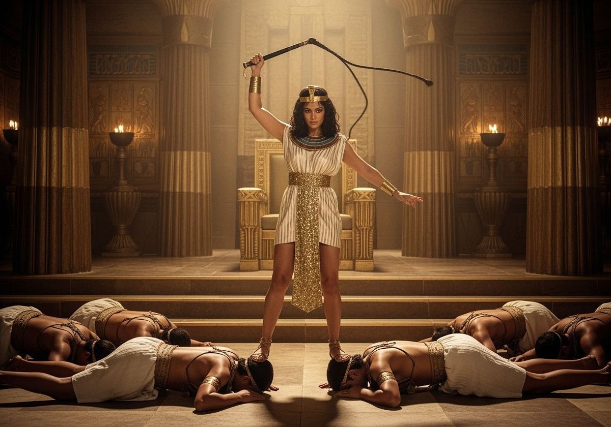 This image depicts a beautiful Egyptian queen in a gold toga, dominating her throne room. Servants in loincloths are prostrated before her as she wields a whip in a cinematic style.