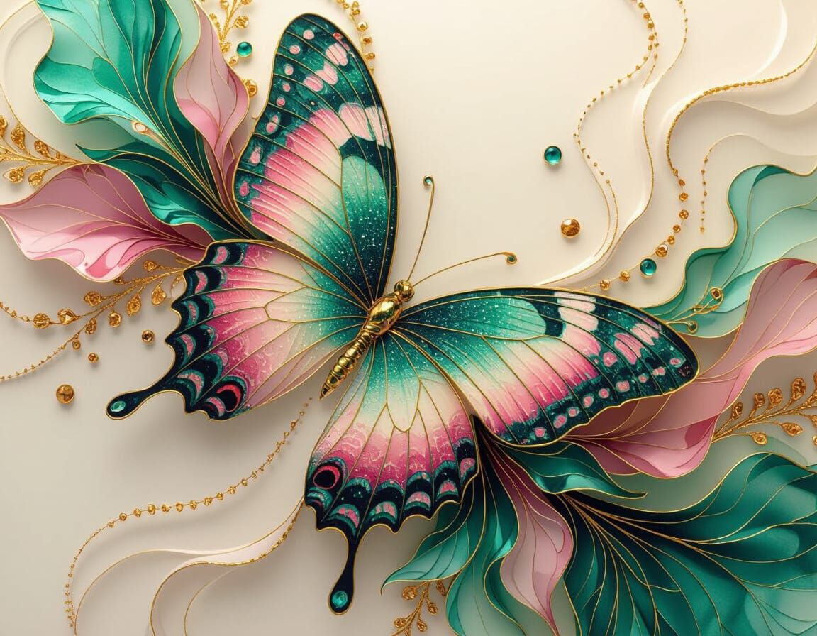 A stunning image of an abstract butterfly in flight with alcohol ink art and fine gold lines. Vivid iridescent emerald, pink, and sapphire wings feature rose-gold metallic accents.