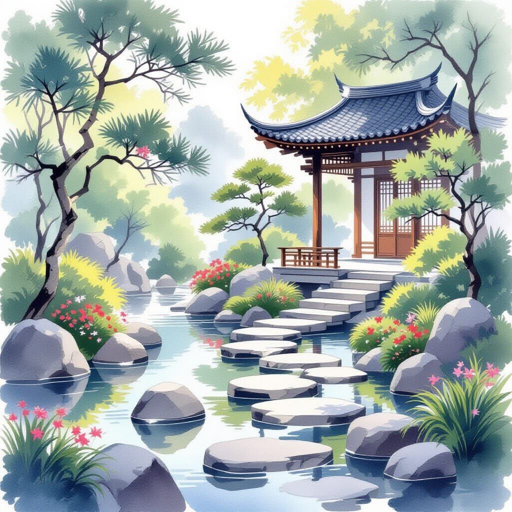 This image depicts a tranquil Asian garden rendered in a realistic watercolor style, evoking a sense of peace and relaxation.