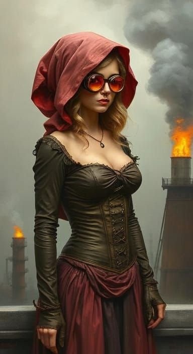A striking picture of a Victorian woman with copper corset on a factory roof. The image is rendered with impasto techniques, turbulent strokes and a color palette of red, orange and cadmium.
