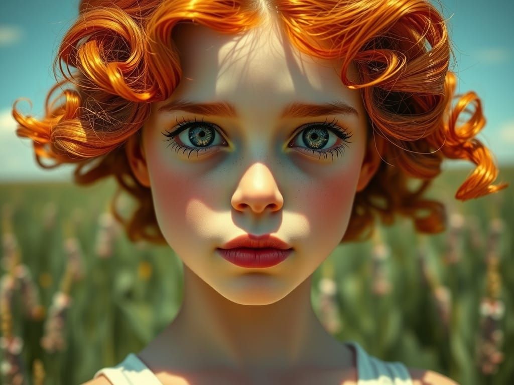 A striking picture of a red-haired girl with an expressive face standing in a green field. The image features macro details, volumetric light and realistic reflections in a vintage autochrome style.