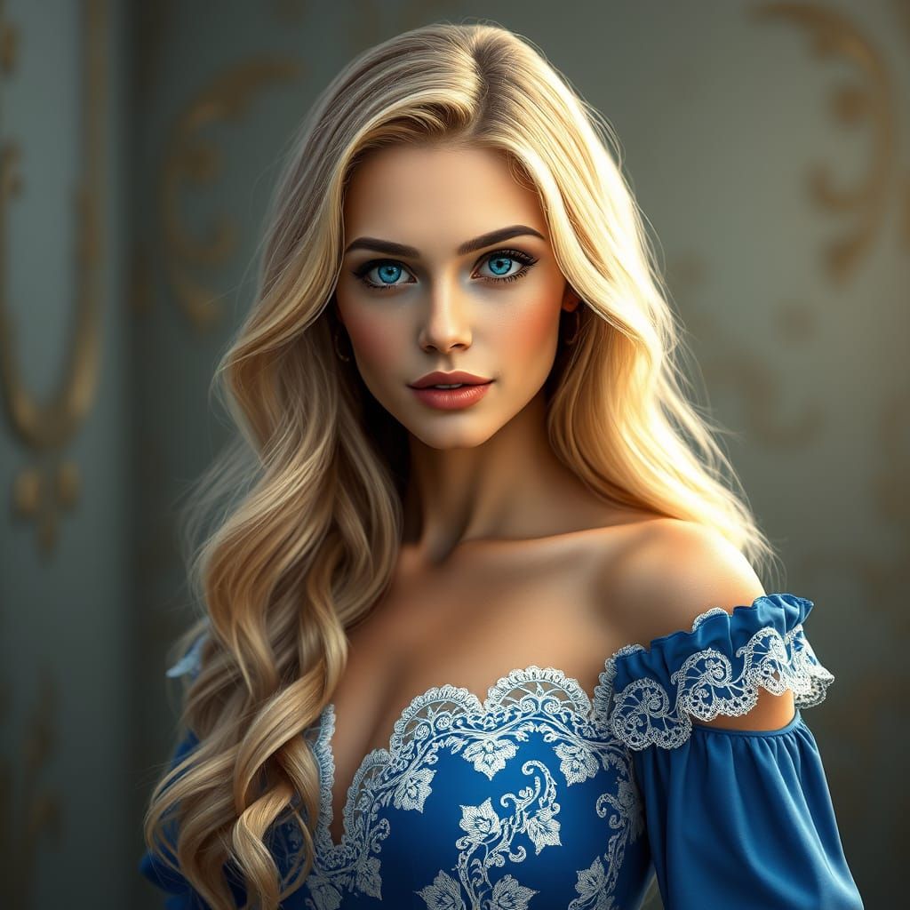 BEAUTIFUL WOMAN with long, wavy blonde hair cascading over her shoulders. She has bright blue eyes and a fair complexion, with a confident and serene expression. wearing a blue dress with lace detailing along the neckline and sleeves, which are off-shoulder and white.
