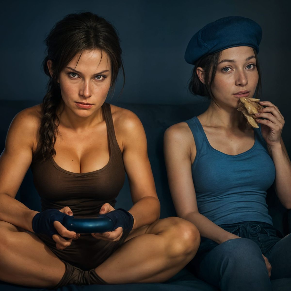 A vibrant watercolor comic scene shows Lara Croft intensely focused while playing a game in lotus position. Jill Valentine sits beside her, looking bored while eating a sandwich in the dimly lit room.