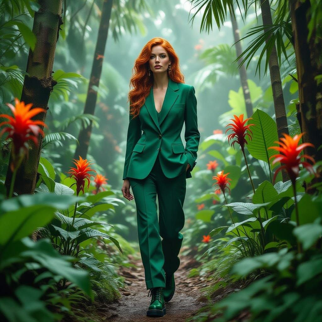 A striking picture of a red-haired woman in a green suit walking through a rainforest. This fashion-style image has a gritty, realistic aesthetic and features bold reds, greens, and blacks.