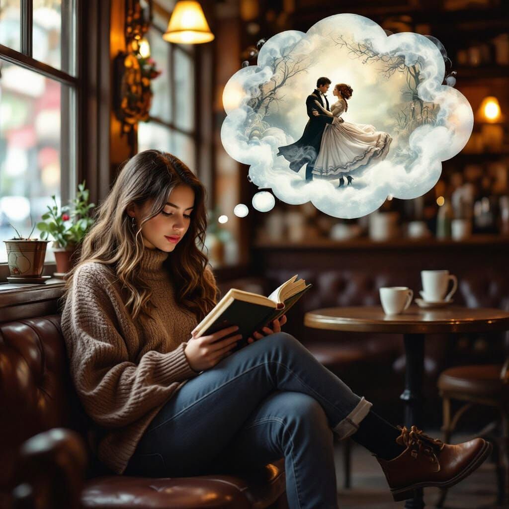 This image shows a teenager reading intently at a coffee shop. Above her, a thought bubble reveals a dreamlike scene of her dancing with a lover in Victorian attire, rendered in a hyper-realistic and romantic style.