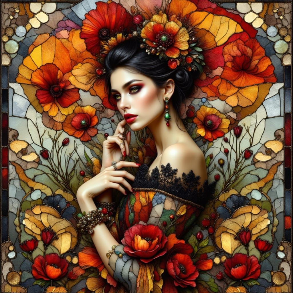 A striking portrait of an elegant woman with dark hair and bold red lipstick, adorned with green earrings. The image is rendered in a vibrant stained-glass style featuring poppies and an abstract background.