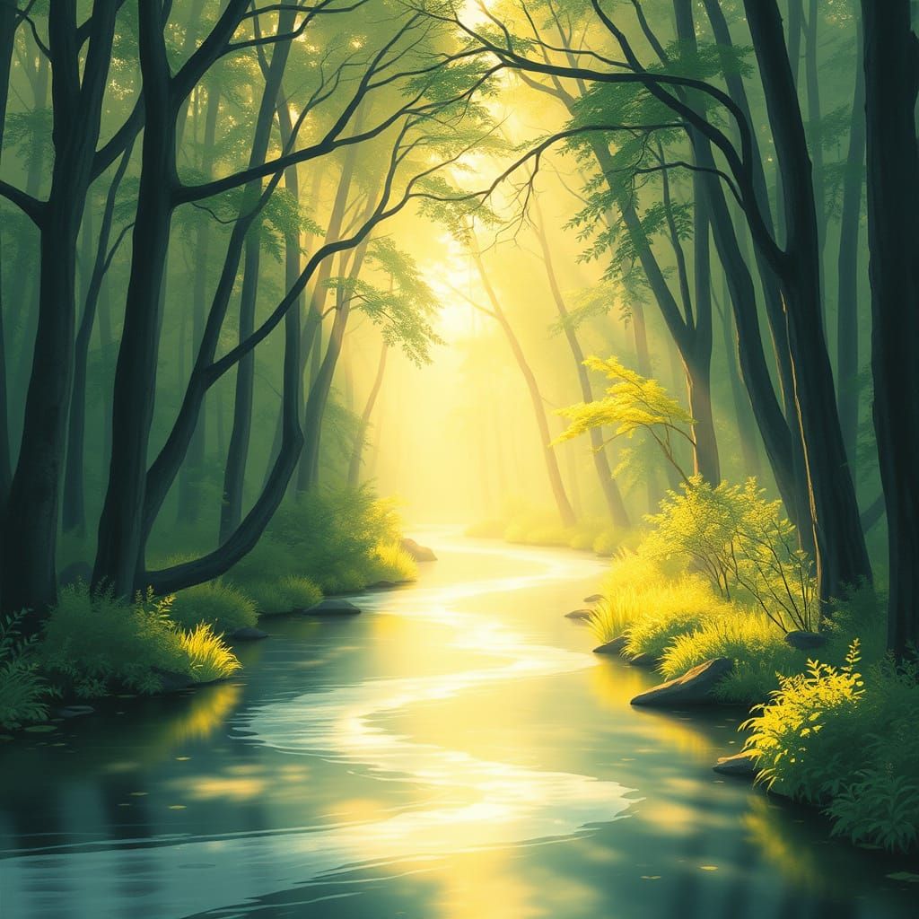 This image depicts a tranquil river flowing silently through a dense, vibrant forest, as sunlight filters through the leaves in a delicate dance, casting a warm glow on the water's surface and surrounding rocks and plants.
