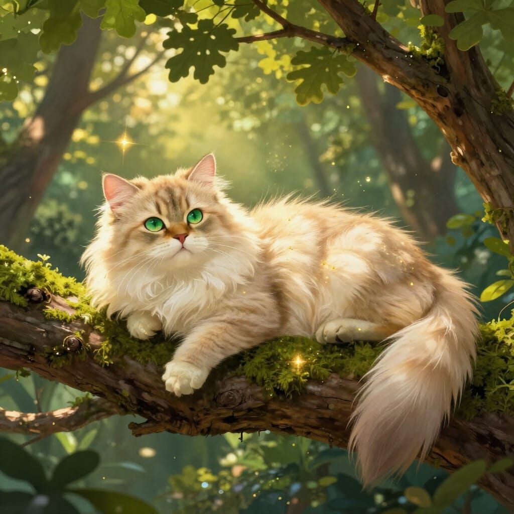 A fluffy Persian cat with emerald eyes and golden sparkles rests on a mossy oak branch. This image features a warm, dreamlike atmosphere with vibrant colors, in a whimsical storybook illustration style.