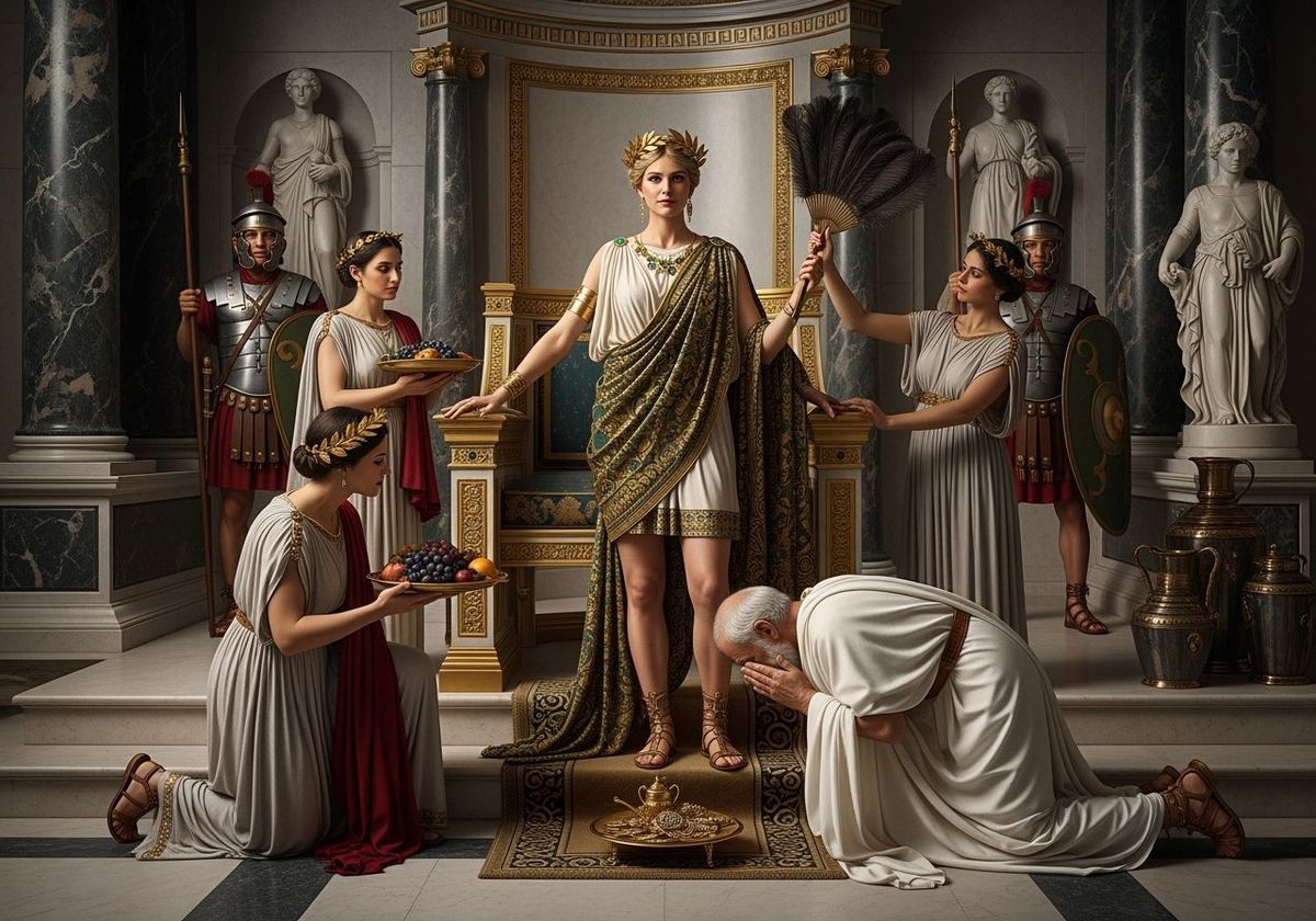This image shows Empress Messalina in her opulent throne room, attended by servants and Roman legionnaires. An old senator pays homage in this photorealistic artwork with natural lighting.