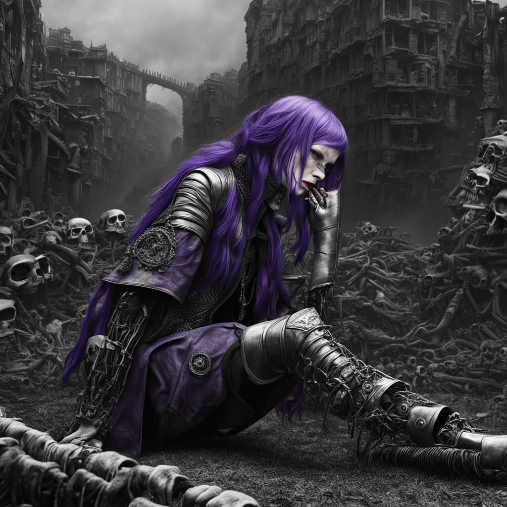 This ultra-realistic photo captures a young girl with purple and black hair, skull face paint, and bone rings. She sits amidst a wasteland with dark mist.