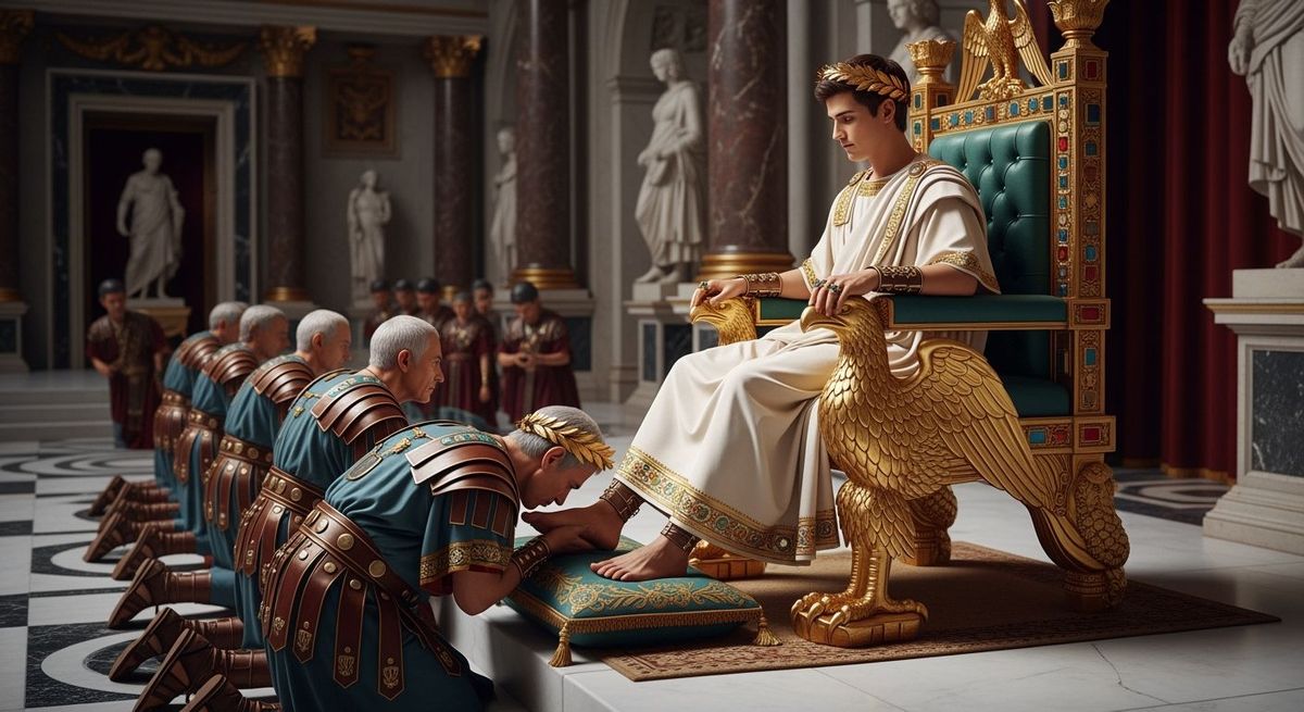 This image shows Emperor Nero seated on an opulent throne in a Roman palace. Senators kneel before him in a show of loyalty within the luxurious throne room, captured in ultra-high definition.