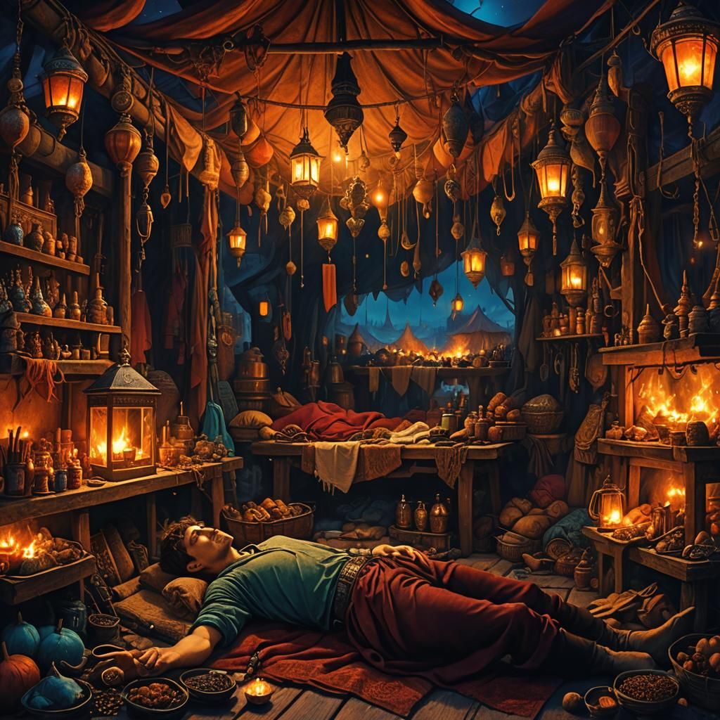 A vibrant image of an ancient fantasy night market filled with magical creatures. Warm candlelight illuminates stalls overflowing with wares in this detailed digital painting with rich textures.