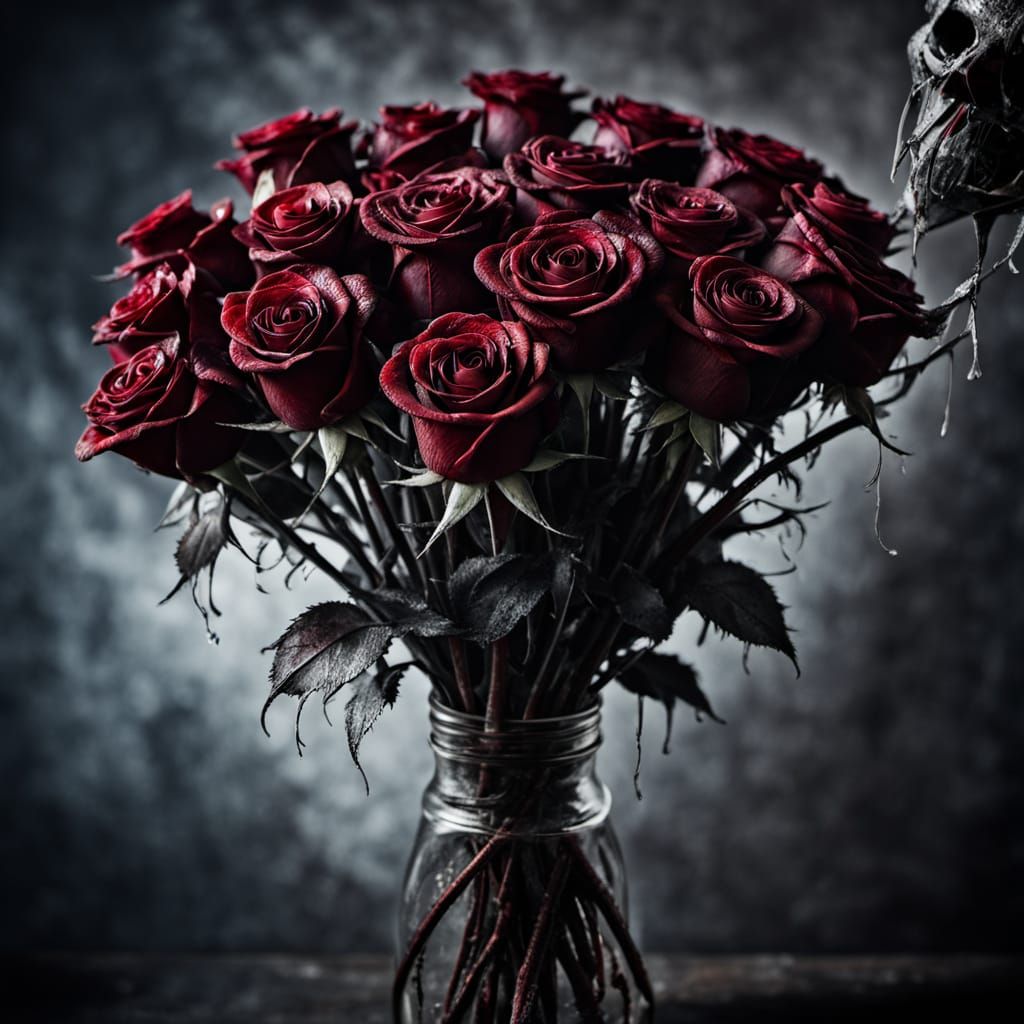 This image captures a hyperdetailed macro view of decaying black and red roses with sharp thorns. Skeletal hands grip the stems, illuminated by an ethereal glow.