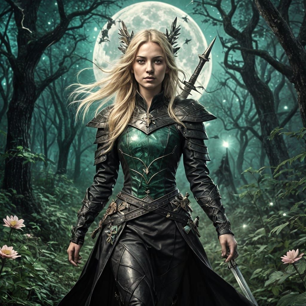 This image shows a blonde, elven warrior in black leather, walking through a glowing forest at night. A small emerald dragon follows her as stars shimmer above.