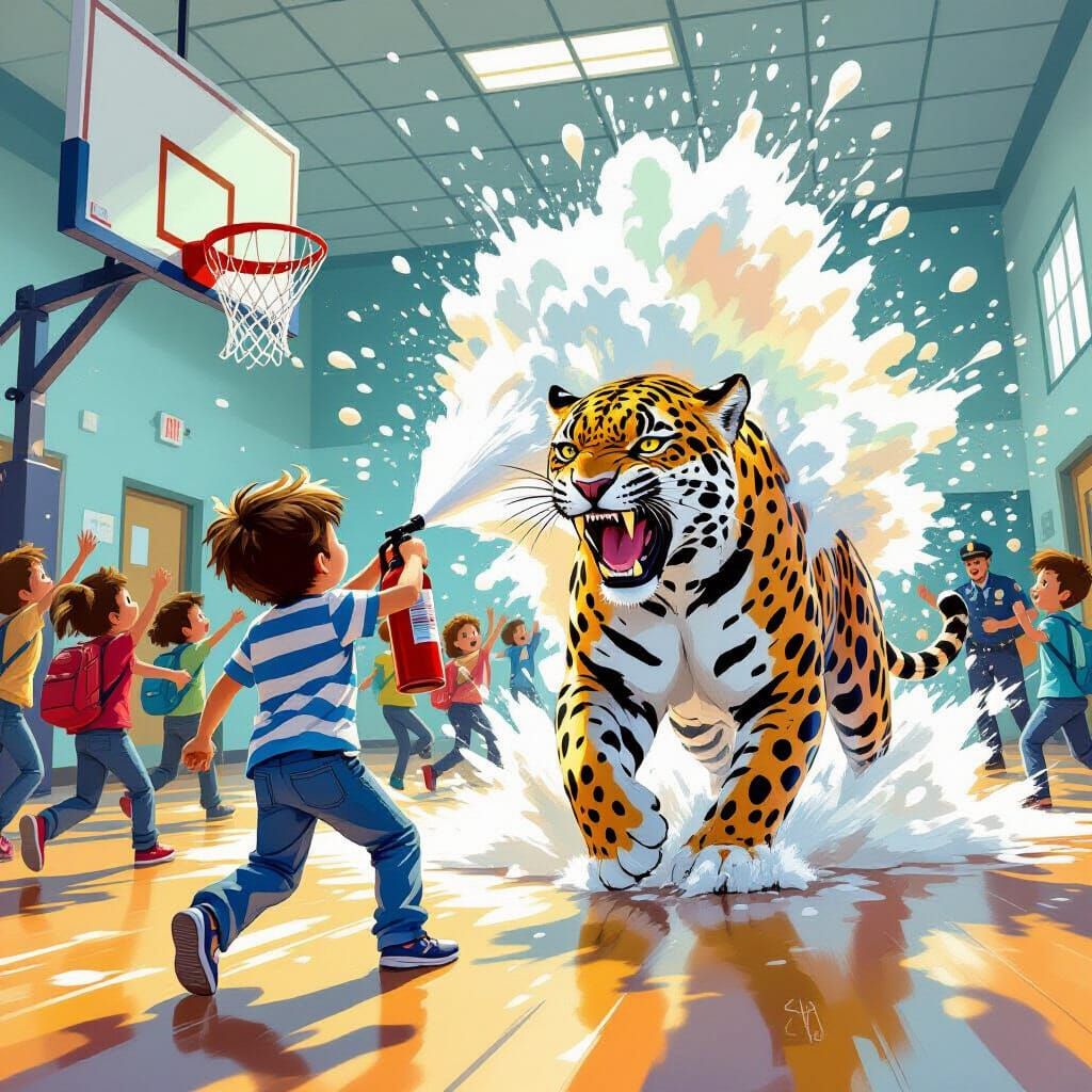 A chaotic scene unfolds in a school hall as a boy confronts a jaguar with a fire extinguisher. Fleeing children and approaching authorities add to the drama, rendered with realistic detail and vibrant colors.