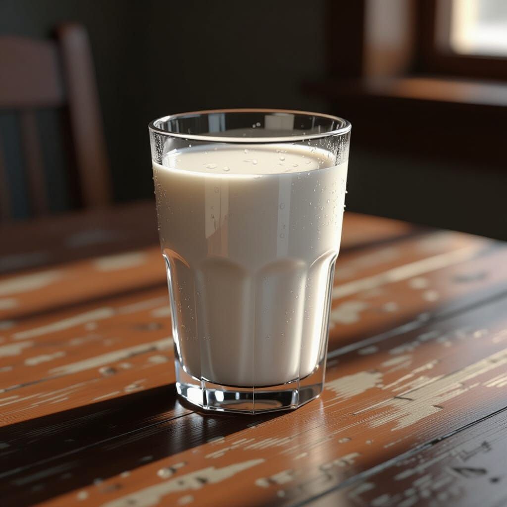 A hyperrealistic image shows a glass of milk, half full, with condensation. The glass sits on a faded wood table with intricate reflections and subtle shading, as a digital render.