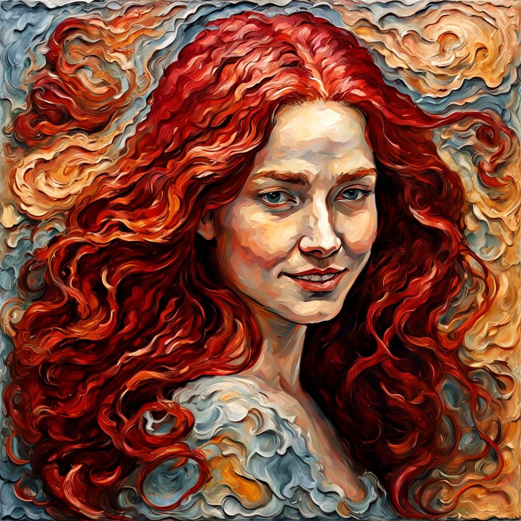 This image shows a medium shot portrait of a beautiful woman with a detailed face and soft smile. Her long red hair is wavy and curly, rendered with thick, textured brush strokes in a warm color palette.