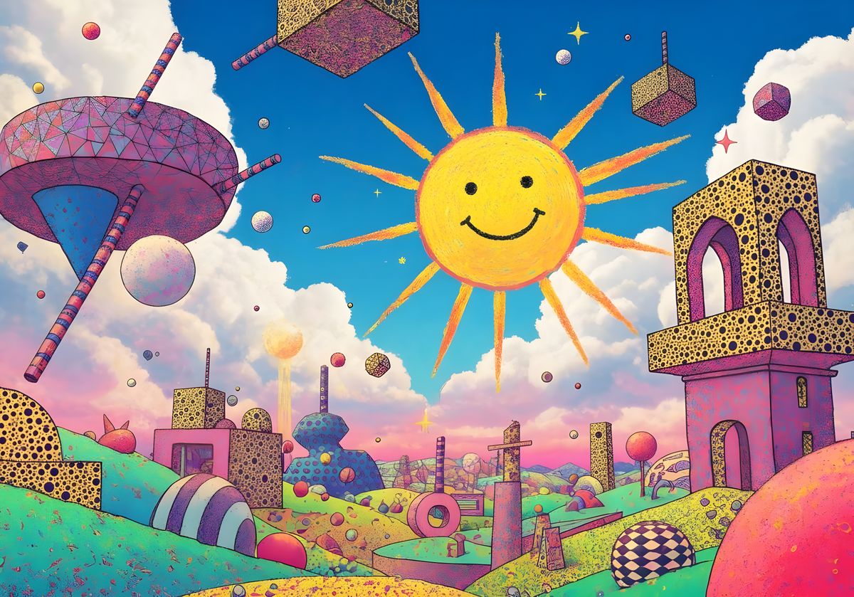 This image shows a child-like drawing of a smiling sun within a vibrant, abstract sky. Geometric shapes and impossible architecture create a dreamlike, intricate digital art piece with bright colors.