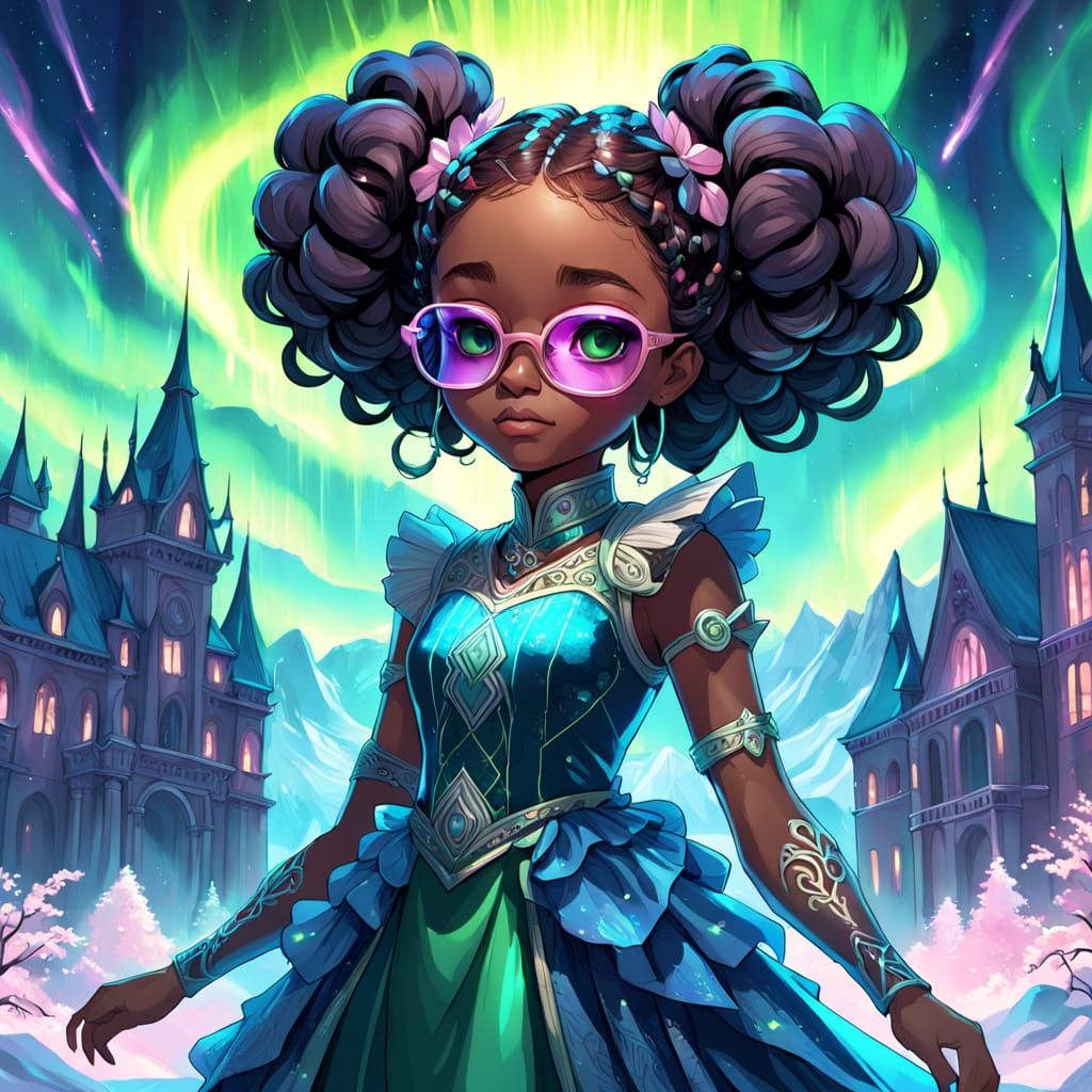 A vibrant digital painting of a joyful young girl in pink glasses and a blue dress, standing before a palace made of the aurora borealis. Features luminous lighting and a deep blue and green color scheme.