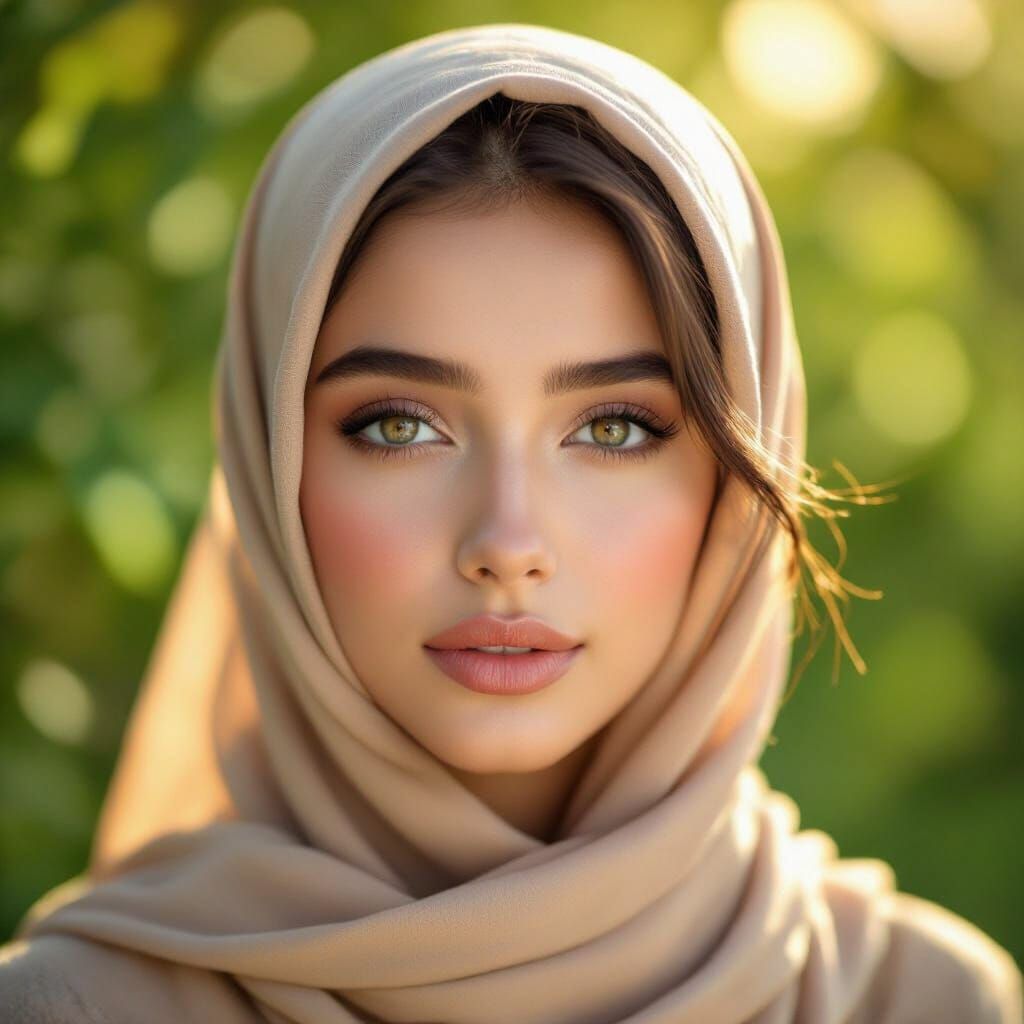 This ultra-realistic photograph captures a beautiful young woman with soulful eyes, bathed in warm golden hour light. The soft bokeh background of green foliage adds depth and focus to her features.