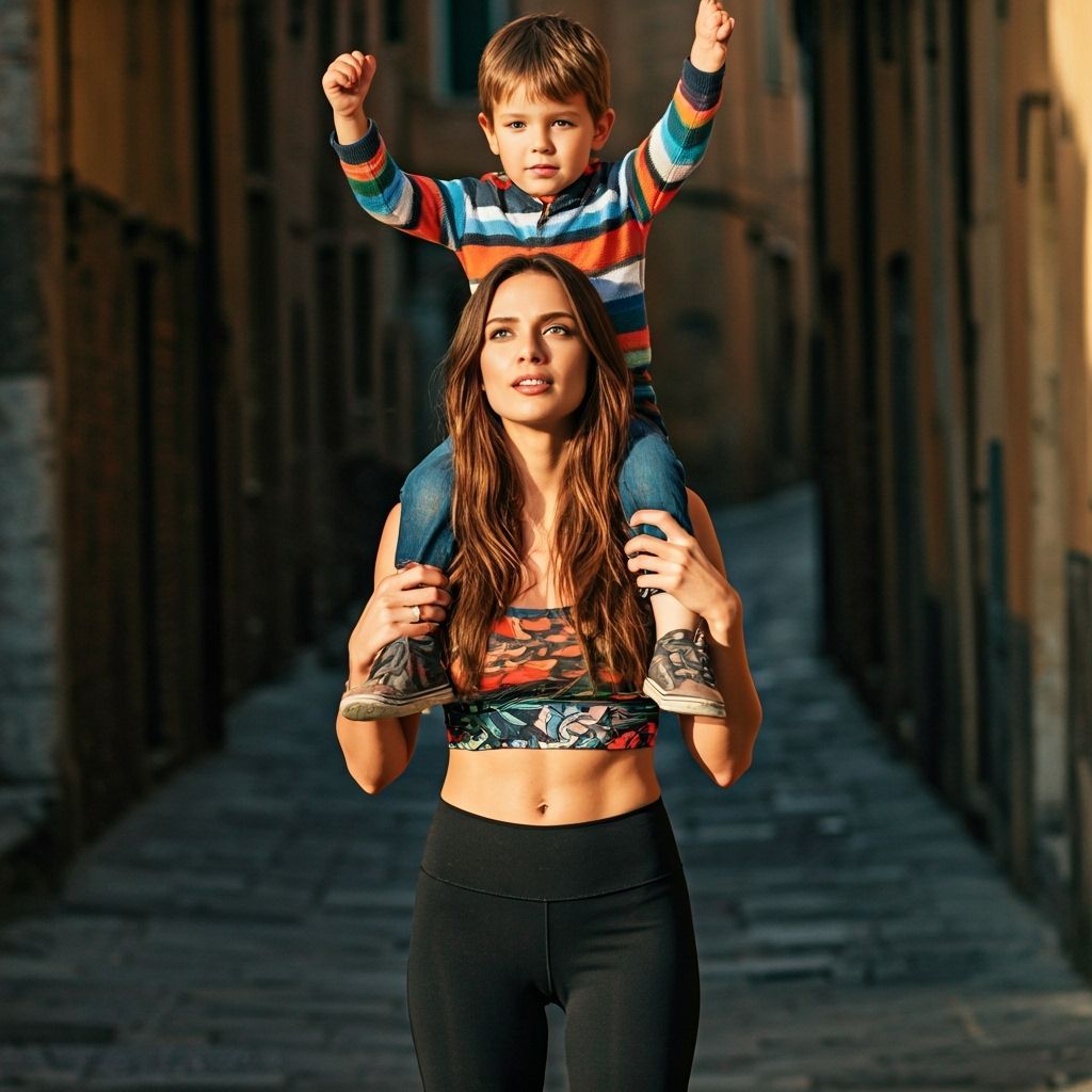 A photorealistic image capturing a tall Italian woman with soft brunette hair carrying a boy on her shoulders. Bathed in warm golden hour light with a shallow depth of field.