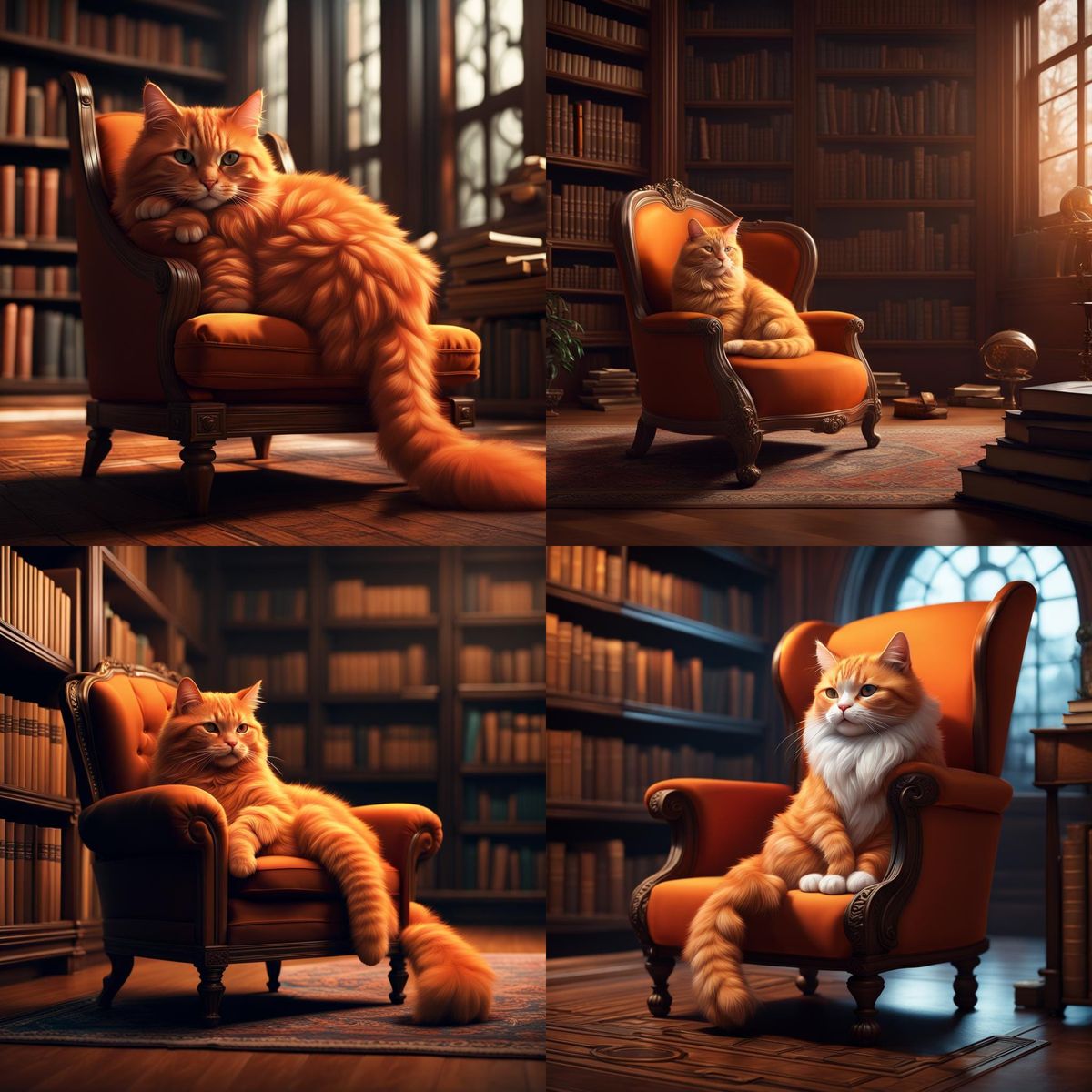This image shows a fluffy orange cat sleeping on a dark orange chair inside a library. The scene is rendered as detailed matte painting with complementary colors, in the style of fantasy concept art.