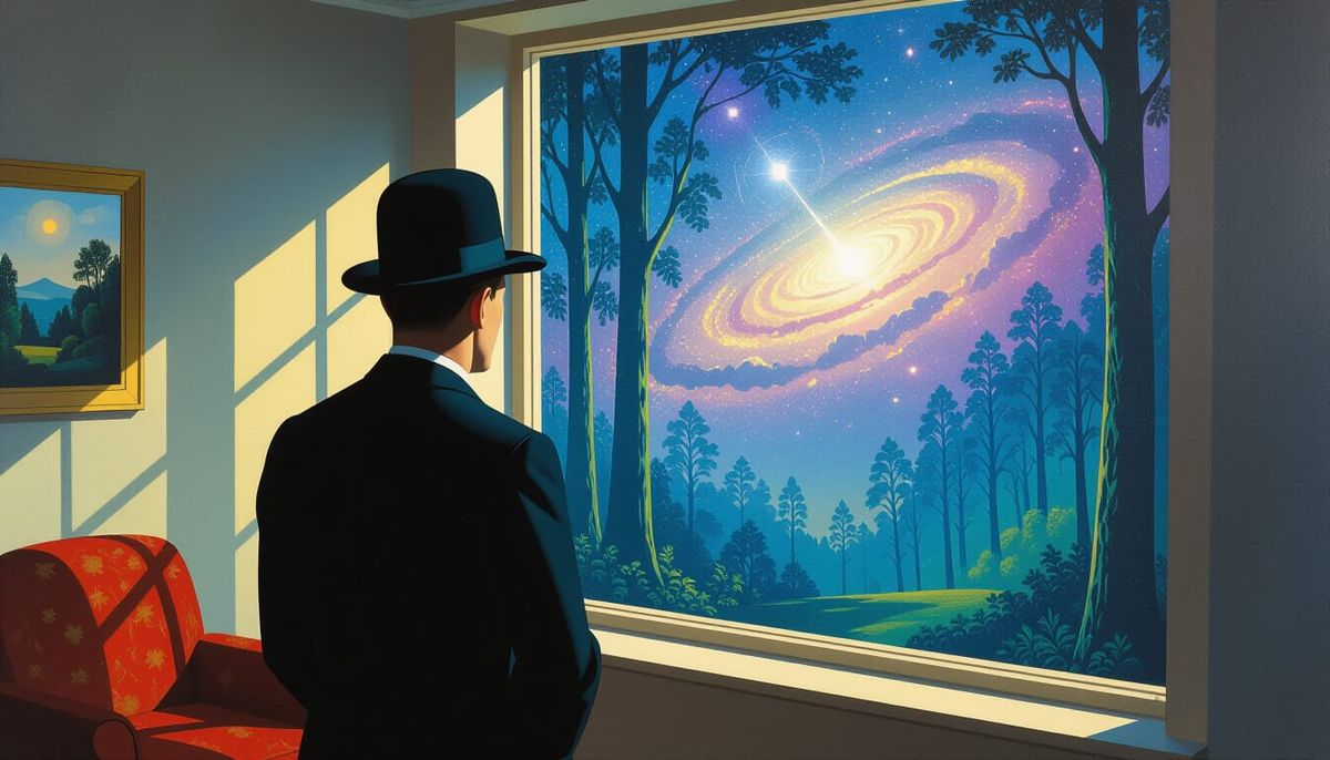 A dapper man observes a mystical Belgian forest from a surreal living room filled with the cosmos. The scene is illuminated by an ethereal glow, rendered in a clear line style with deep narrative detail.