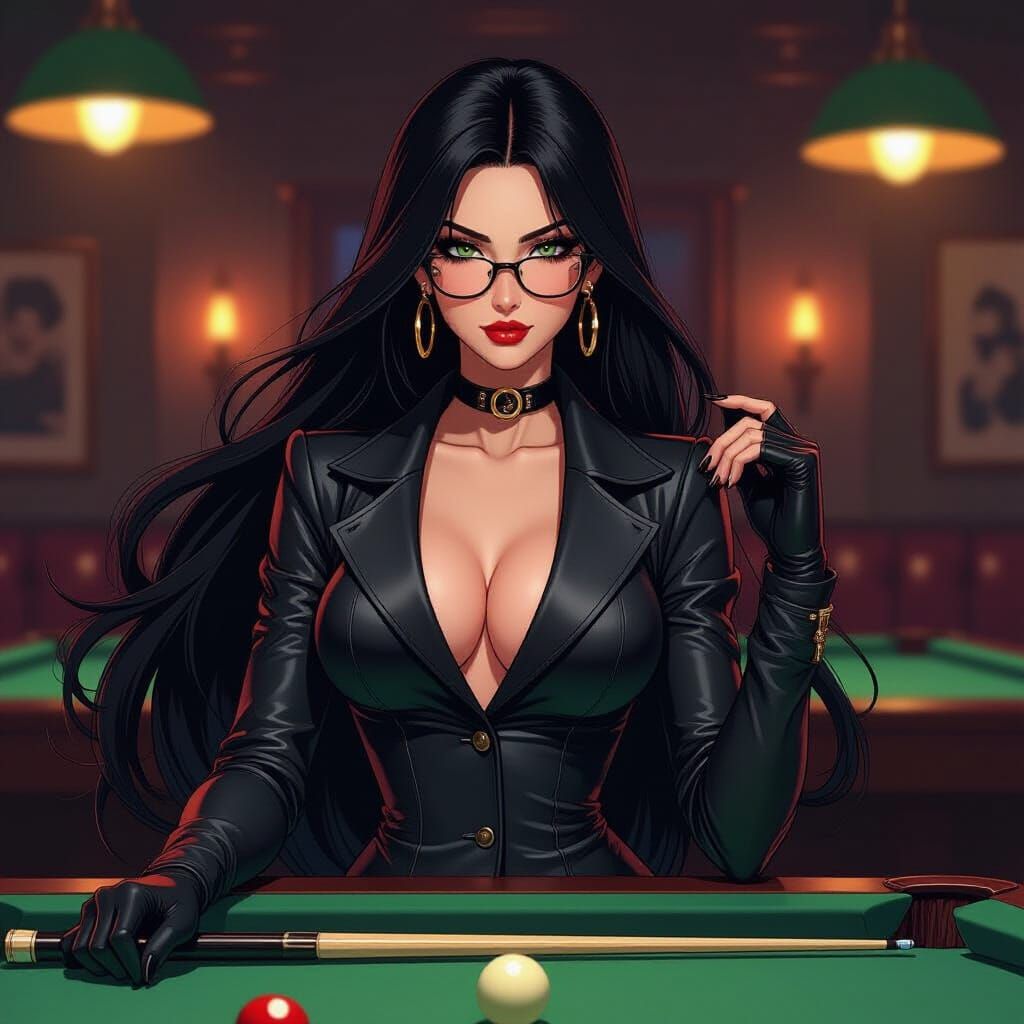 This illustration features a striking woman in an 18th-century anime style, wearing a black leather suit and glasses. She poses confidently with a billiard stick in a dimly lit bar, depicted with intricate linework and dramatic color gradients.