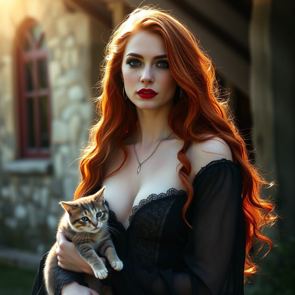 This cinematic image depicts a beautiful goddess with flowing red hair, makeup, and silver jewelry, sitting outside a country cottage with a cat. Dramatic lighting and a pre-Raphaelite style enhance the epic scene.