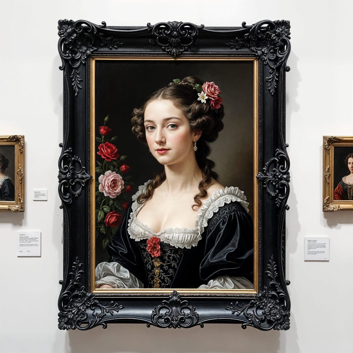 A striking picture of a baroque woman with flowers. The hyperdetailed charcoal drawing is displayed in a black ornate frame, as if hanging in a museum.