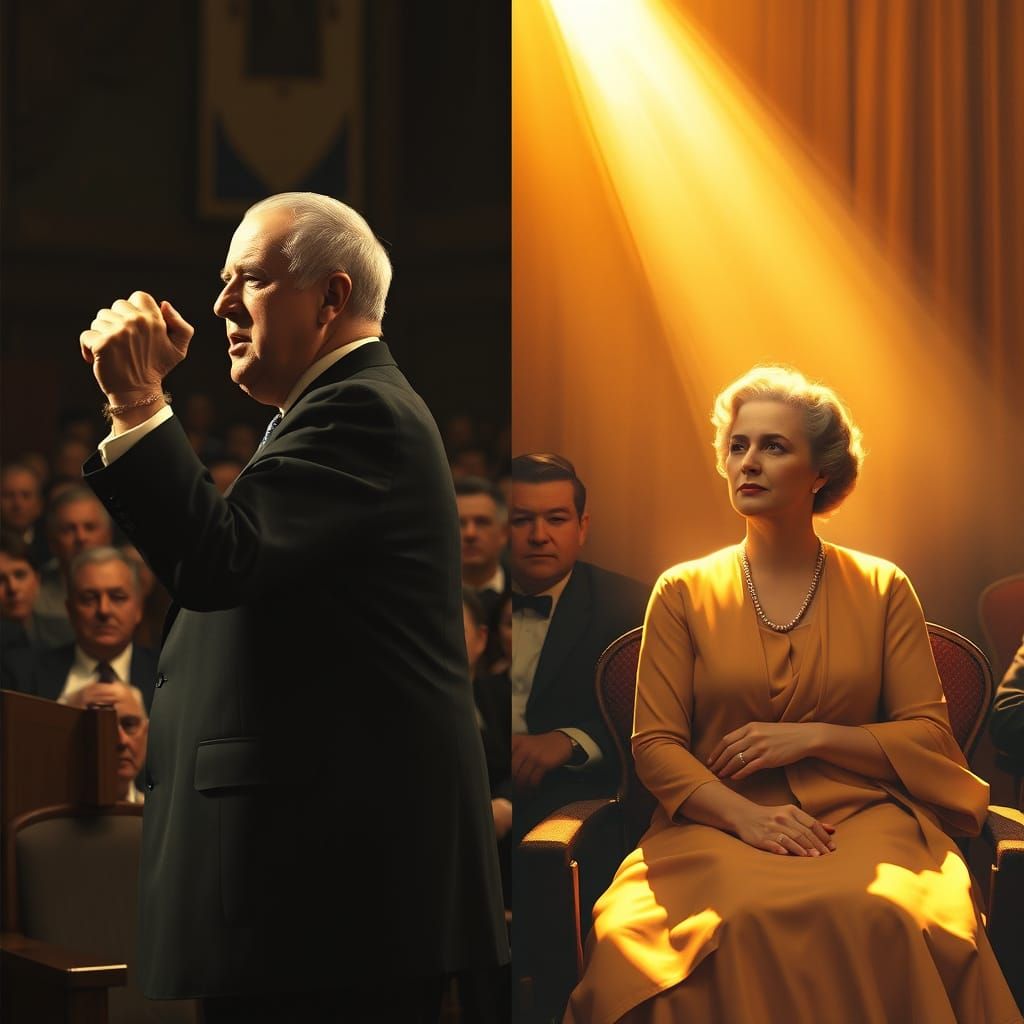 This image shows Franklin Roosevelt giving a speech while Eleanor Roosevelt sits quietly. The art style evokes early 20th century American illustration blended with art nouveau influences, emphasizing light and emotional contrast.