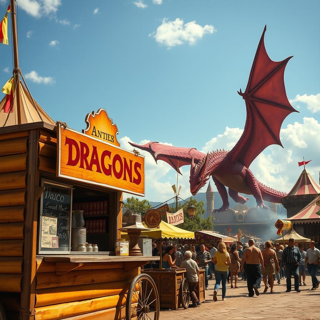 This image captures a bustling medieval fantasy county fair, where a humble taco food cart offers exotic dragon meat, amidst a backdrop of colorful streamers, funnel cakes, and roasting meats, with a majestic red dragon soaring in the distance, in the style of 35mm film with cinematic lighting and a warm...