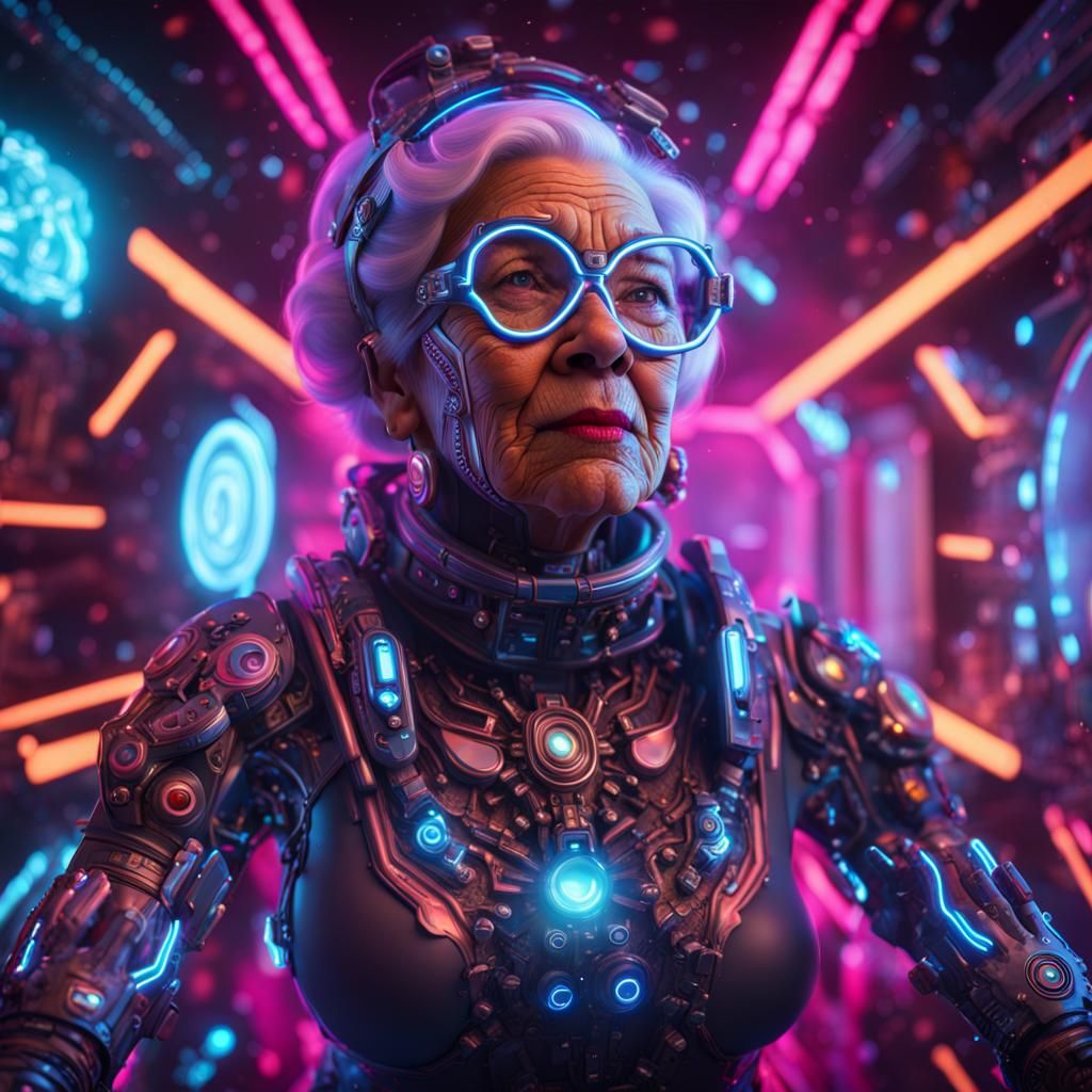 This image depicts a cyborg grandmother floating in space. The scene is rendered in high resolution with neon lights and dynamic lighting, resulting in an intricately detailed image.
