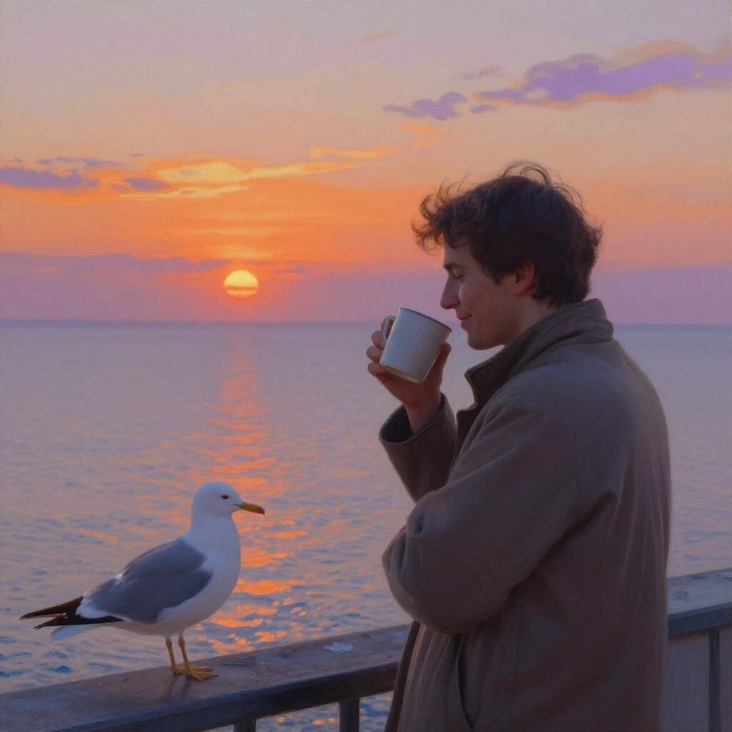 This image shows a peaceful lighthouse keeper enjoying a warm drink at sunset. The scene is rendered in a soft, impressionistic style with a focus on light and color, capturing a moment of quiet contentment.