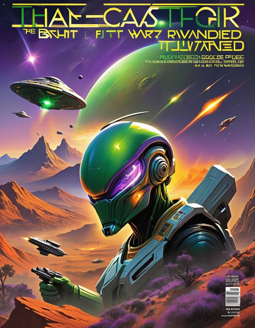 A striking picture of a science fiction magazine cover featuring an alien landscape under attack. The foreground shows a shocked alien, rendered with fine details and complementary colors.