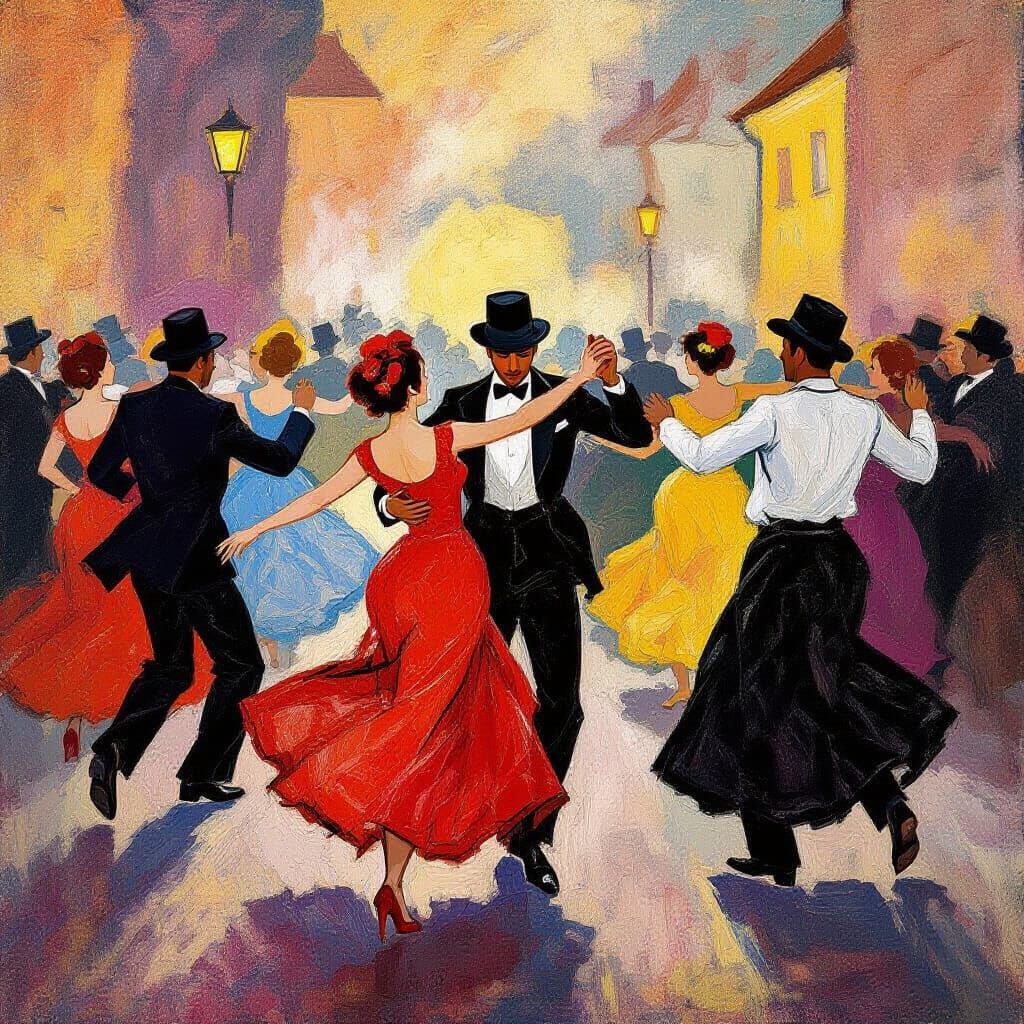 This illustration captures energetic festival dancers with vivid, contrasting colors and dramatic light and shadow. Textured brushstrokes enhance the feeling of movement and emotion.