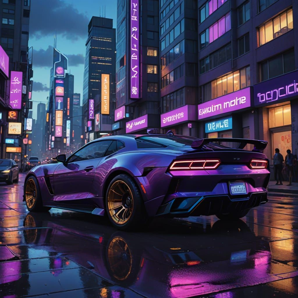 This image shows a futuristic cityscape with a purple car parked in front of towering buildings. Neon lights reflect off the car's surface in a cyberpunk aesthetic with purple and blue hues.