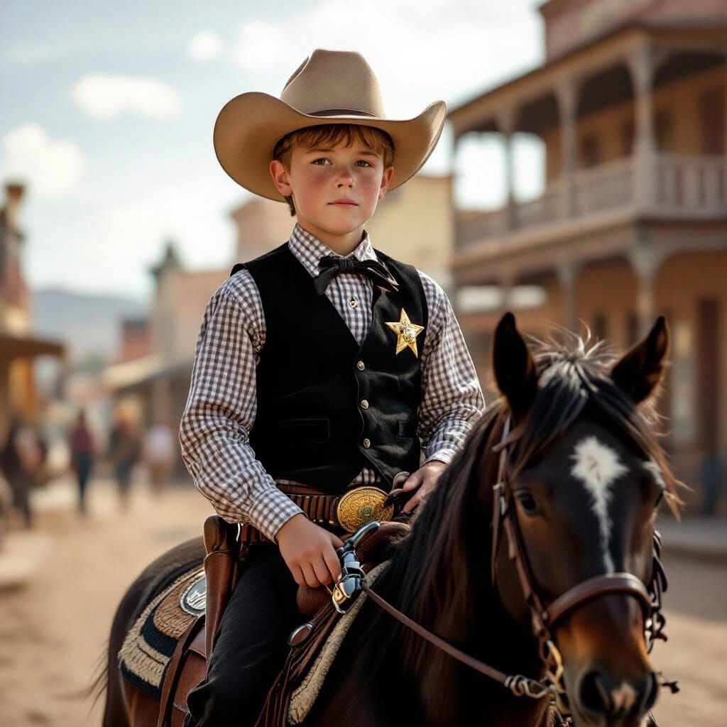 This realistic, painterly image shows a young boy dressed as a town marshal, riding a black pony down a 1870s western street. Features dusty lighting and a sepia tone.