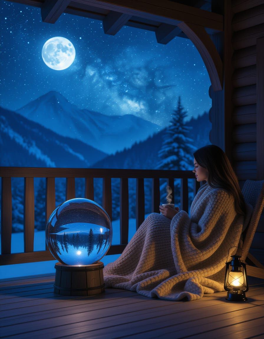This hyperrealistic image shows a woman on a cabin veranda at night, holding a steaming cup. A glass orb reflects the starry sky, with moonlight and a lantern creating a peaceful atmosphere.