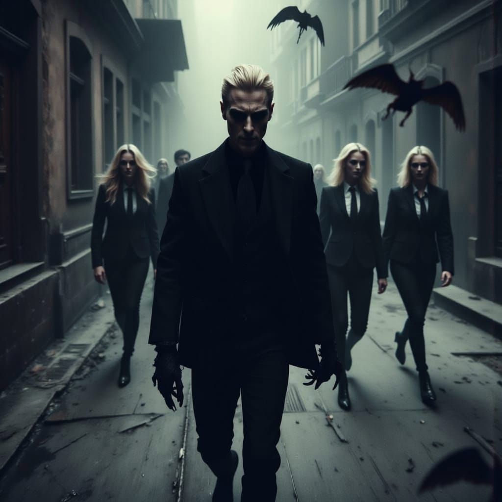This image shows a young, blonde vampire in a black suit, followed by two women. Shadow monsters leap toward him, with frost marking his steps in this atmospheric, cinematic still.