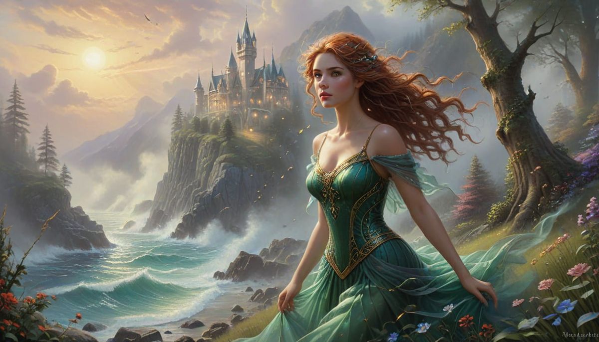 This image shows a stunning young woman with auburn hair and emerald eyes standing outside in misty twilight. Rendered in a hyperdetailed, ethereal fantasy style.