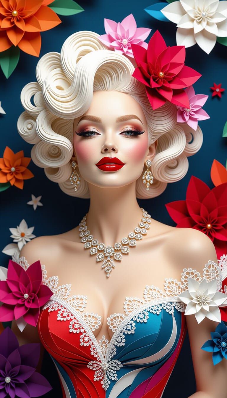 A hyperdetailed image of a glamorous woman in a lace gown, with curly hair and a playful smile. The artwork is set against an Escher-style architectural background and includes resin wire art and origami paper folds.