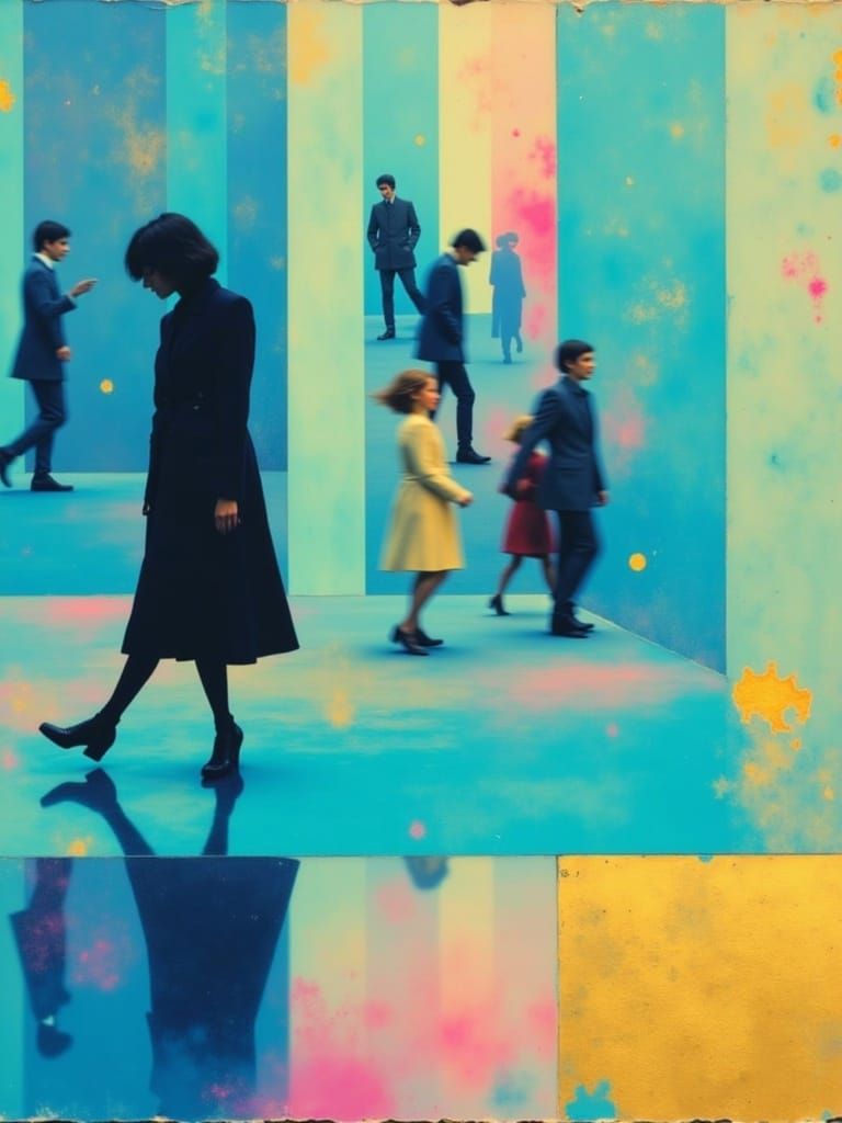 This image shows abstract silhouettes in fluid motion, rendered with cool pastel colors and burnished textures. It features a psychedelic gilded background with gold color blocks, evoking a dreamlike and futuristic aesthetic.