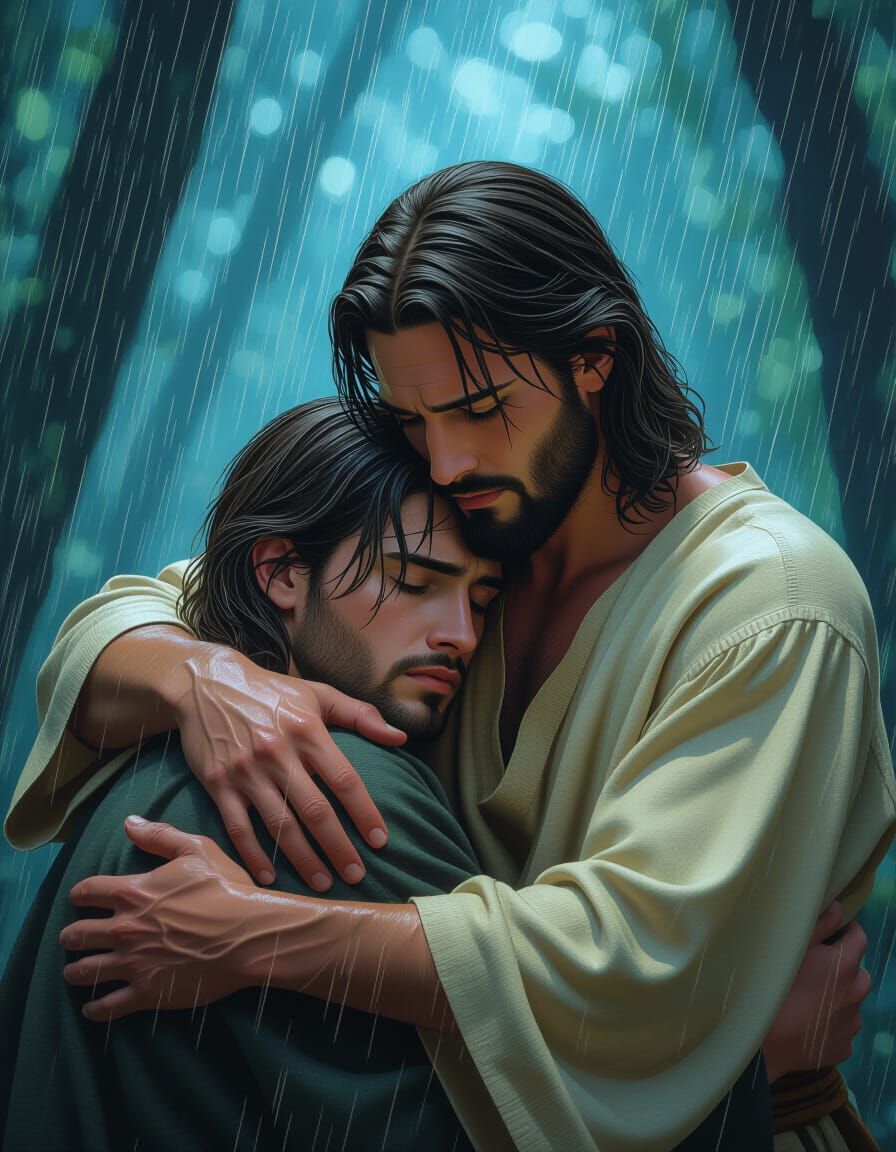 A comforting image shows Jesus embracing a young man in a dark forest during a storm. The scene is rendered as a detailed matte painting with deep, complementary colors.