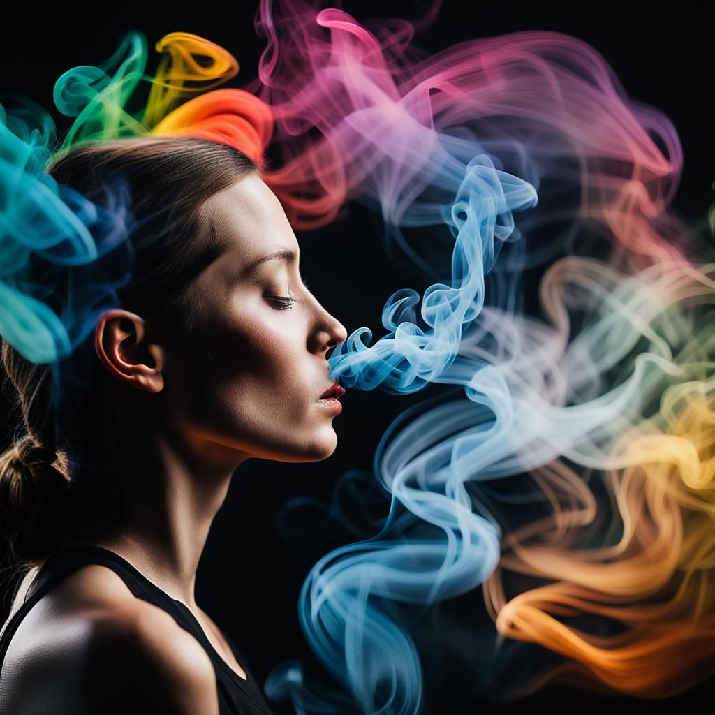 A striking picture of a woman's profile formed by vibrant rainbow smoke against a stark black backdrop. The image captures surrealism with soft focus and iridescent colors.
