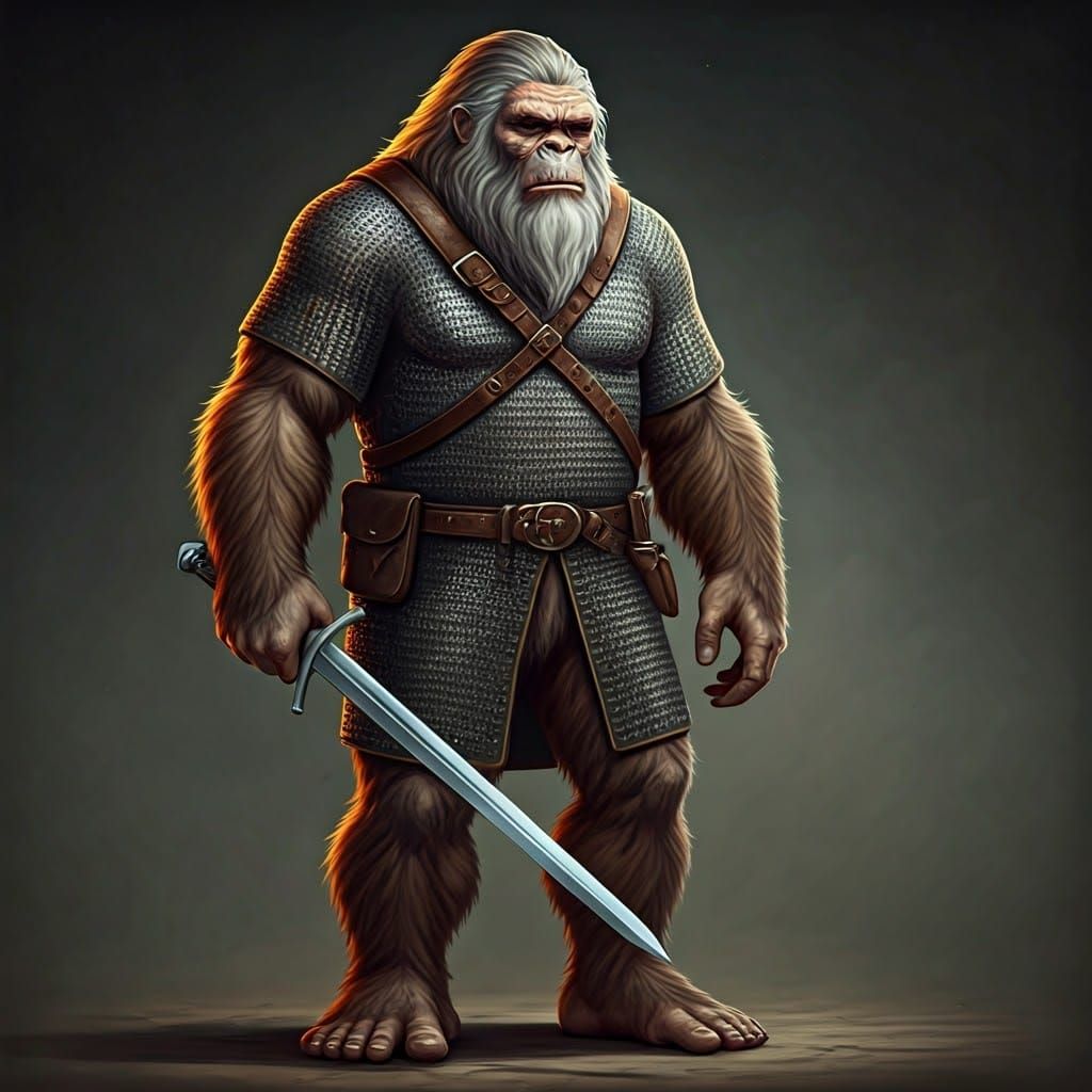 A digital painting depicts a bigfoot adventurer brandishing a sword and clad in chain mail. The artwork captures a whimsical, heroic figure in a fantasy setting.
