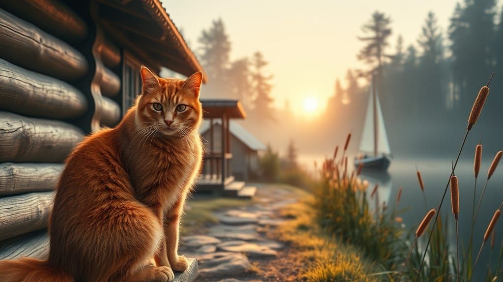 This serene image captures a picturesque forest lake at dawn, with a sailboat in the distance and a red cat lounging on a log porch. The atmosphere is tranquil, with a focus on the play of light and water, rendered in a digital painting style.