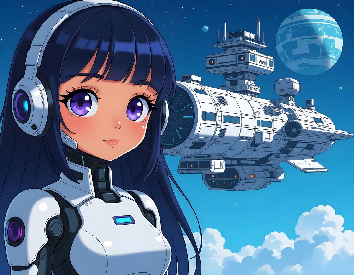 This image shows a cyborg girl with purple eyes in front of a space station. The medium shot artwork features soft shading, vibrant colors, and intricate details reminiscent of 2D cartoon art.